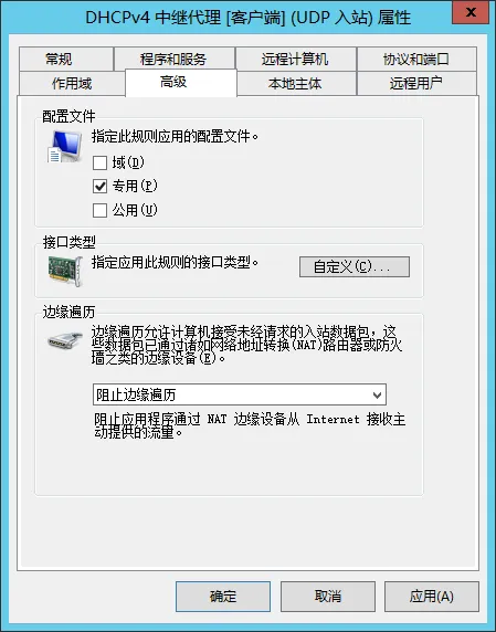 例如如下DHCP的规则,需要在已经自动启用的情况下,补充设置LAN接口的作用域仅对专用网络有效: